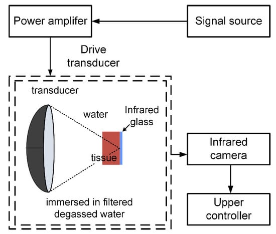 The experimental system is shown in Figure 3. The excitation signal was generated by the arbitrary signal generator (DG5072, RIGOL, Beijing, China). the signal passed through the power amplifier (AR800 W, Amplifier Research, Souderton, PA, USA) and drove the transducer to irradiate the continuous wave (the transducer parameters were consistent with those in the simulation). The transducer and tissue were immersed in degassed water, and the upper surface of a bovine liver tissue sample was attached to the infrared glass and placed in focus. The infrared glass was placed in the field of view of a 50 Hz infrared camera (K23a17, HJKIR, Wuhan, China) and the temperature distribution of the bovine liver at different power-focused ultrasounds was recorded.