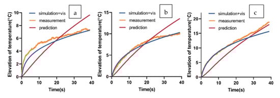 Temperature elevations at 1.5 mm away from the focus (a) 4 W, (b) 6 W, and (c) 8 W. The yellow solid lines present the measured temperature (measurement). The blue solid lines present the simulated temperature considering viscous heating (simulation + vis). The red solid lines present the predicted temperature (without glass and without VH) in the pure bovine liver (prediction).