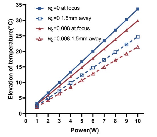 Accurate prediction before operation and optimal control during treatment are the keys to achieving therapeutic effects and avoiding adverse effects when focused ultrasound is applied in tumor ablation. The development of acoustic cavitation, boiling, and shielding of large bubbles and their effects on temperature has not been accurately evaluated and is not included in the classical numerical simulation model. Therefore, it might not be reliable to predict the temperature when the intensity of 1000 W/cm2 was applied to the tissue; high temperature would lead to tissue boiling and bubble formation and might induce more undefined and less predictable necrosis. These would challenge the effective temperature control during the treatment []. For focused ultrasound (MIFU) with an intensity below 1000 W/cm2, the intensity range was below the cavitation threshold and the temperature increase mainly depended on the thermal effect, and it was easy to assess and predict temperature during treatment. The goal of this study was to control tissue temperature rise until reaching the threshold for thermal necrosis (55 °C), which could more safely achieve the palliative treatment of tumors. Therefore, this study focused on the intensity range of moderate-intensity focused ultrasound (100 W/cm2 ≤ I ≤ 1000 W/cm2), and discussed the temperature rise at different power in a bovine liver. The simulated and measured results showed that (1) the temperature of the tissue induced by the MIFU at the end of sonication was linearly related to the power and (2) the effect of blood perfusion on temperature increased with the power increase.