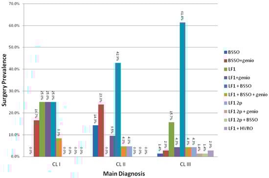 Association between primary diagnosis and surgery type. Note the high prevalence of LF1 + BSSO surgeries in CL II + CL III groups, found to be statistically significant (p = 0.003). Legend: BSSO—Bilateral Sagittal Split Osteotomy, LF1—Le-Fort 1 Osteotomy, LF1 2p—Two Piece Maxilla Le-Fort 1 Osteotomy, VRO—Vertical Ramus Osteotomy, CL I—Skeletal Class I, CL II—Skeletal Class II, CL III—Skeletal Class III.