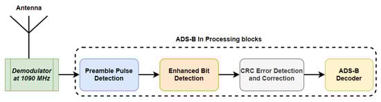 The system structure and related MATLAB simulation processing blocks are displayed in Figure 1. It composes of the Demodulator at 1090 MHz, Preamble Pulse Detection, Enhanced Bit Detection CRC Error Detection and Correction, and the ADS-B Decoding blocks on the receiving side. Details related to each block are provided in the following sections.