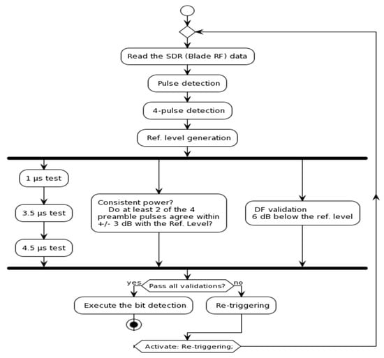 In the initial stage, SDR needs to be configured according to ADS-B frequency, bandwidth as well as sampling rate, afterward the received data will be validated based on the leading edge in order to find out the pulse position [25]. In the second stage, when four pulses with the same spacing as the Mode S preamble are found, the preamble detection process starts to validate four pulses with timings of 0, 1.0, 3.5, and 4.5 microseconds. During preamble detection, a Reference Power Level is produced for purpose of re-triggering and demodulating the entire data block. It computes based on middle samples matching with pulse position and power of samples which are within 2dB tolerance. In the next step, 1, 3.5, and 4.5 microseconds tests are done to detect later preamble pulses if there is any overlapped signal. For instance, a test for one microsecond is necessary to look for high power in the pulse positions 1, 2, 4.5, and 5.5 microseconds following the start to address this potential overlap issue.
