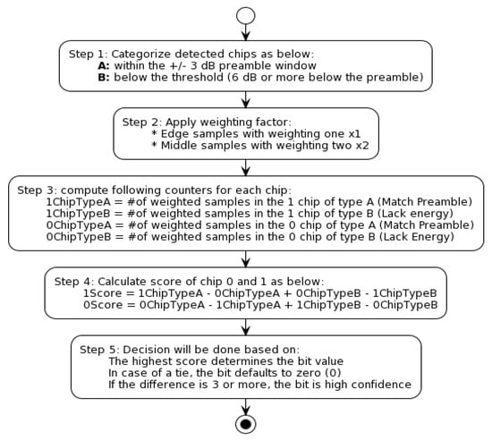 The preamble is thought to be matched by samples that fall within the amplitude window and this is indicated by ChipTypeA and referred to as Match Preamble in the flowchart. While the lack of transmitted energy is thought to be indicated by samples that fall below the minimum threshold and it is indicated by ChipTypeB. Therefore, in the third step, counters of ChipTypeA and ChipTypeB for a bit “0” and “1” need to be computed.