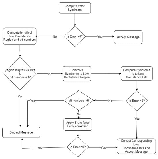 By employing the “Brute Force” method of Cyclic Redundancy Check (CRC) based on the bit and confidence declarations outlined above, it is possible to discover and fix ADS-B data bits errors. Figure 5 is the flow of the detailed error correction procedure. Upon receiving ADS-B data a CRC error detection can produce an error syndrome. If the error syndrome is equal to “0”, the ADS-B message is accepted. If it is not “0”, the algorithm checks the possibility of error correction by computing the length of the low confidence region and the number of its bits. Only when all the message’s low confidence bits fall within a 24-bit frame and there are no more than 12 low confidence bits, the error correction algorithm will perform. In the first step, the conservative technique applies, if the error is corrected, the message will be modified accordingly and accepted, otherwise try every set of low confidence bits that is conceivable (if there are more than five low confidence bits, the received ADS-B data is discarded) and accept the set that is equivalent to the error syndrome.