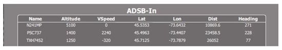 The components of an ADS-B burst data are immediately classified by their Type Code value. The key attributes downlinked by every Type Code are call sign, latitude, longitude, altitude, speed, tracking angle, and vertical rate. Within the same group, Type Code values also have their individual indicators. For instance, a TC of 1 to 4 in the identification group denotes various aircraft categories as described by the Mode-S standard in accordance with [1]. Therefore, the message decoding is performed based on Type Code (5 bits), ICAO aircraft address (24 bits), and Data (56 bits). It is highly important to link data with the same ICAO in order to have a consistent track of aircraft. All mentioned activities have been done and validated with the open-source code of the pyModeS decoder [27]. Figure 6 shows a sample outcome of the UGC application for ADS-B In during the flight test. It displays each flight ID information including position and velocity information, and distance from the airplane in the table format.