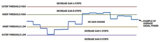 SDR system has an analog front end to deal with received analog signals [28]. It is crucial to provide a suitable signal prior to digital conversion with the ADC (Analog to Digital Converter). The slow attack mode is designed for signals that change slowly, such as those in several FDD applications, like WCDMA and FDD LTE. The second-order control loop with hysteresis used by the slow attack AGC modifies gain to maintain the average signal strength within a predefined window. Using the AD9361 RF Agile Transceiver within the Blade-RF, the receiver gain control mode function is activated on AGC slow attack mode. The control loop’s concept is shown in Figure 7 [28] which stores the inner high threshold and inner low threshold settings in negative decibels relative to full scale (dBFS). The outer high threshold and outer low threshold parameters are set as dB deltas to the inner thresholds. Programmable gain step sizes are available for A, B, C, and D. The gain index pointer’s modification, once an average signal power threshold is exceeded, depends on these step sizes.