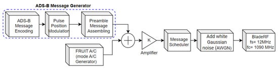 Cross-correlation and leading-edge are two major approaches that are examined in the Simulink environment based on the Figure 9 simulation test bench. Figure 9 shows that ADS-B message generator block is combined with primary interference FRUIT A/C; afterward, it is amplified and sent to the ADS-B message schedular in order to send the message based on transmission rate (it could be periodically or random); then white Gaussian noise is added to the signal, and ultimately, the signal is transmitted by BladeRF with a sampling rate of 12 MHz and central frequency of 1090 MHz.