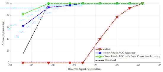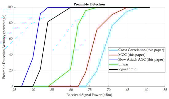 Figure 10 demonstrates preamble detection accuracy for various tests including cross-correlation, Leading-edge in MGC mode and slow attack mode, and linear and logarithmic amplifier approaches. Linear and logarithmic amplifier approaches’ values are exploited from the article [22]. Based on the results, slow attack AGC mode has a 100 percent preamble detection in 2 dB weaker signal power than the logarithmic amplifier approach.