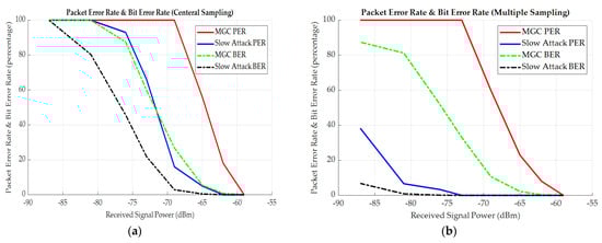 Similarly, the same test is performed for the measurement of packet and bit error rate of both central sampling and multiple sampling methods in various modes. Figure 11 illustrates explicitly that slow attack PER and BER in the multiple-sampling method is far better for poor signal than other methods. It is worthwhile to note that error correction is not applied during PER and BER tests.