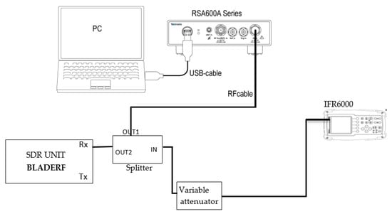 Figure 12 shows the test bench diagram which is designed to perform sensitivity tests in the lab. As the block diagram illustrates, the IFR6000 test equipment generates ADS-B signals, afterward, the signal is weakened by a variable attenuator. Then splitter provides two outputs of signal with the same signal strength; one of them is used as Rx input of ADS-B In for the SDR unit under the test and another one is used as spectrum analyzer input to do power measurements. Note that the power splitter is generating 3 dB losses for both parties. Therefore, the received signal power level at BladeRF RX and Spectrum analyzer input is the same.