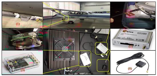 (1) Aircraft DME antenna; (2) Installed System inside Aircraft; (3) BladeRF V2 SDR; (4) Aircraft; (5) PC (Cincoze system; (6) Connector to DME antenna; (7) ublox(GPS); (8) ublox antenna.