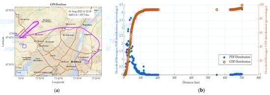 (a) Flight test route; (b) Percentage of decoded messages distribution in PDF and CDF vs distance in Km.