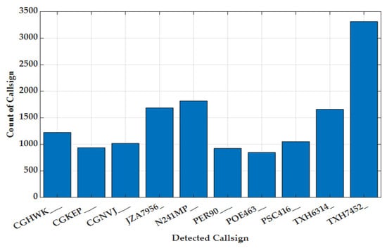 Apart from real-time displaying ADS-B In results, the flight test post-processing and logs analysis was done to validate system performance. In summary, two flight tests were conducted on 13 July and 1 August 2022, the flight duration was about 80 minutes and 70 minutes respectively. Overall, over 137,000 messages without error were decoded, and 185 unique flight IDs were identified. In Addition, the top ten detected flight IDs were identified and validated with FlightAware [30] log history data. Figure 16 shows the top 10 detected messages related to the call sign during the flight on the 1st of August 2022. It is important to mention that the call sign is extracted from BDS08 burst data which broadcasts every 5 seconds, and it is used to match position and velocity data to aircraft identification based on ICAO.