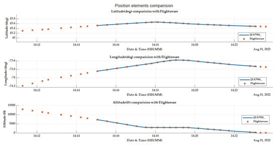 Position elements (latitude, longitude, and altitude) comparison with FlightAware data.