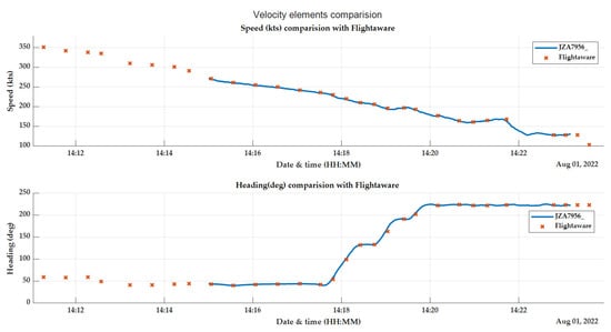 The sample result of the comparison is demonstrated in Figure 17 and Figure 18. Figure 17 shows position elements including latitude, longitude, and altitude comparison of sample aircraft with FlightAware logs. In addition, Figure 18 provides velocity factors consisting of speed and heading comparison for the same aircraft data with FlightAware logs. In both cases, the results are quite matching for a considerable time range (8 min). It signifies that the system is capable to track aircraft continuously without missing any data and it validates the system integrity performance.