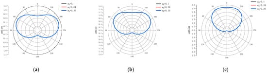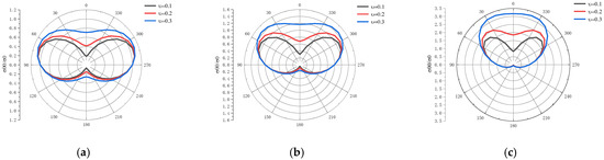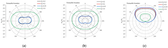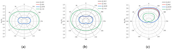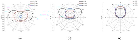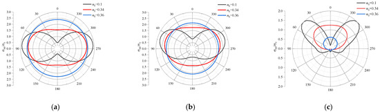 Taking the second set of parameters in Table 1 with Sr = 0.6, Figure 4 gives the distributions of around the cavity surface for P1 wave incidence for different Poisson’s ratios of υ = 0.1, 0.2, and 0.3 with k0a = 0.5, 1.0, and 2.0 under impermeable conditions, respectively. As can be seen from the figure, with the increase in Poisson’s ratio, the stress increases gradually under different frequencies, and the angle at which the maximum value occurs gradually approaches the direction of the incident wave direction. For example, when k0a = 2.0, the maximum values for υ = 0.1 occur at 50° and 310°, whereas for υ = 0.2, at 40° and 320°, and for υ = 0.3, at 20° and 340°. For all Poisson’s ratios, the minimum values appear at 180°. Moreover, with the increase in the incident frequency, the angle between the maximum value direction and the incident wave direction ( 0°) decreases at the same Poisson’s ratio. For υ = 0.3, the maximum values appear at 70° and 290° when k0a = 0.5, at 40° and 320° when k0a = 1.0, and at 20° and 340° when k0a = 2.0.