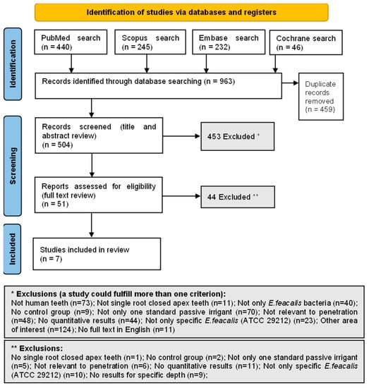 The databases search resulted in 963 articles. Removing duplicates left a total of 504 studies, of which 453 studies that were deemed not relevant to the topic of the current study were excluded. The 51 remaining full-text articles were evaluated to provide 7 articles for inclusion in the systematic review [23,24,25,26,27,28,29] (Figure 1).