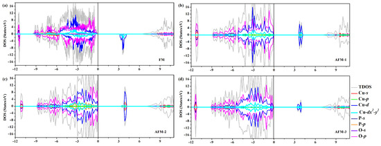 To get a deeper insight into the band structure, the spin-polarized total density of states (TDOS) and partial density of states (PDOS), computed using HSE functional, have been plotted together in Figure 3. In all the four cases of magnetic ordering, the broad oxygen bands are located between −9 and 0 eV, with an admixture of Cu 3d band states above −5.5 eV corresponding to the [CuO] pyramid. Specifically, the top of the valence band (VBM) is primarily composed of O-2p electron states with a slight admixture of Cu-3d states, particularly Cu orbital states. Oppositely, the CBM is mainly composed of Cu-3d electron states hybridized with O-2p states, especially in the AFM-2 case, which is resolved as the magnetically active orbital [11]. This relevant hybridization was identified using Wannier functions and LDA for Cu states [11,58]. Figure S5 zooms into the magnetic layers of [CuO] structural dimers, containing two edge-sharing [CuO] plaquettes, which are separated from each other by nonmagnetic [PO] tetrahedra in -CuPO. More exactly, the spacer layers consist of [PO] pyrophosphate groups formed by joining two [PO] tetrahedra into a corner-sharing structural unit. Thus, the magnetic orbital lies in the plane of [CuO] plaquette which for two possible magnetic coupling pathways, i.e., Cu–O–Cu and Cu–O–Cu pathways.