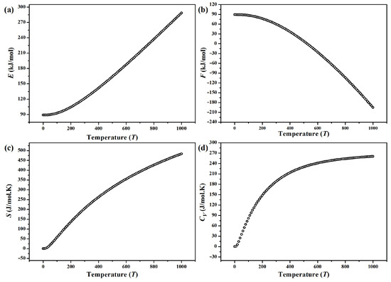 The internal energy E, Helmholtz free energy F and entropy S of -CuPO, calculated in the temperature range of 0…1000 K using a 2 × 2 × 1 supercell (Z = 8) and expressed per mole of CuPO molecules at the molecular volume of 130.268 Å, are shown in Figure 7a–c, respectively. Due to the vibrational contributions, E and S increase gradually with increasing the temperature, while F exhibits a non-linear decrease. Besides, the calculated zero-point energy of -CuPO phase is = 89.04 kJ/mol. (Note that the values of thermodynamic properties plotted in Figure 7 are expressed per mole of CuPO formula units).