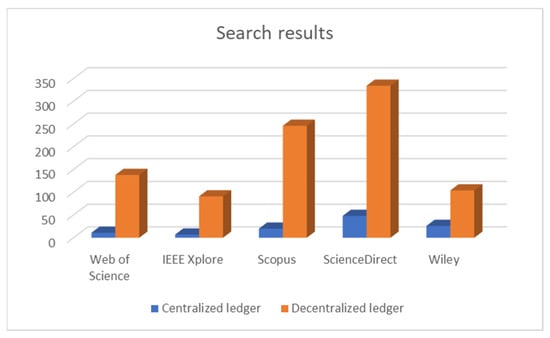 In order to provide a more comprehensive understanding of this research topic, we have reviewed the scientific literature based on the Web of Science, IEEE Explore, Scopus, ScienceDirect, Wiley, and Google Scholar scientific database. We have used search keywords, such as “centralized ledger” or “centralised ledger” and “decentralized ledger” or “decentralised ledger”, in order to identify the relevant research articles, studies and chapters. Table 1 presents the search queries in the explored databases that are limited to the title, abstract and keyword fields of scientific publications. There were no restrictions in terms of the publication dates.