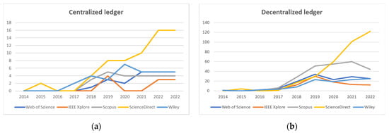 (a) Evolutionary trend in the number of publications covering centralized ledgers; (b) Evolutionary trend in the number of publications covering decentralized ledgers.