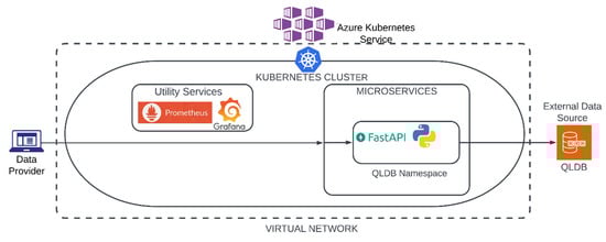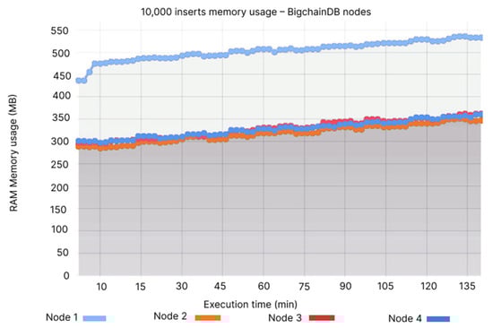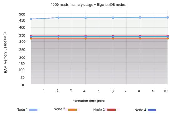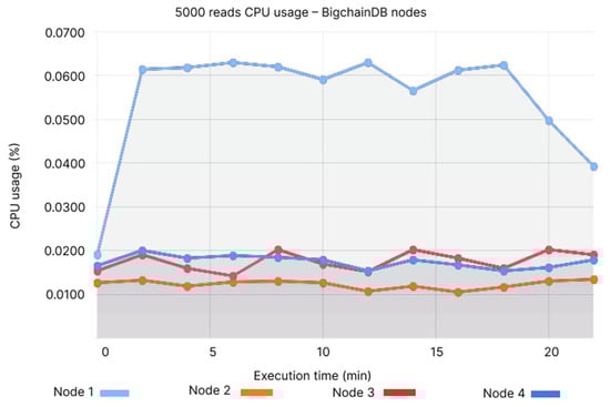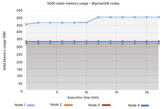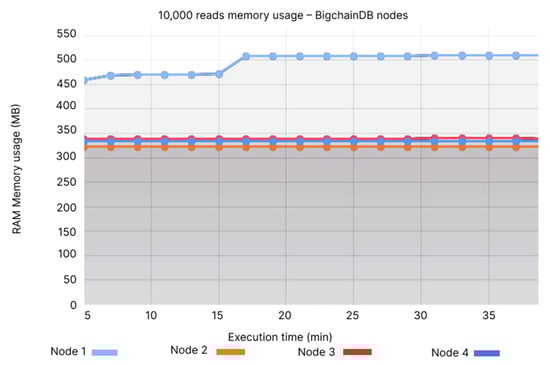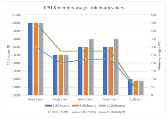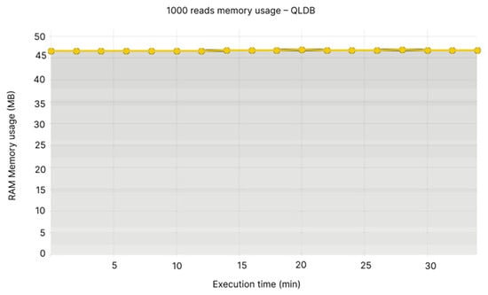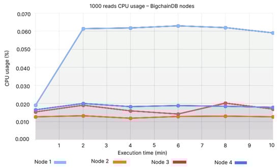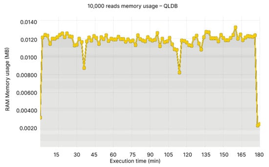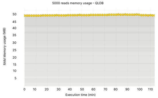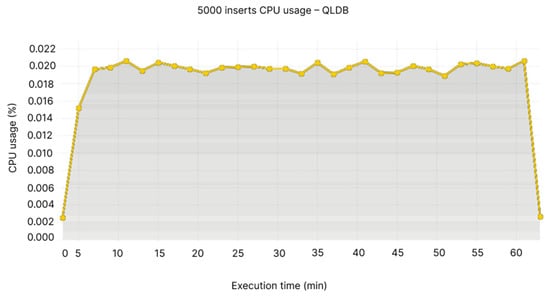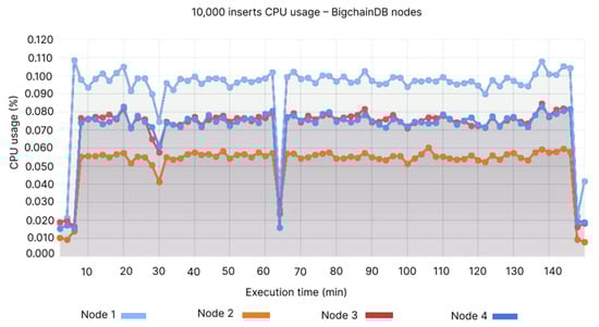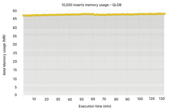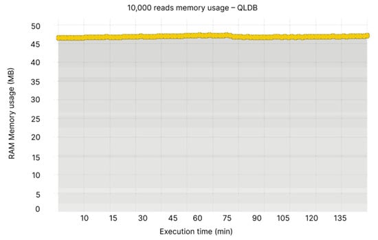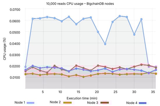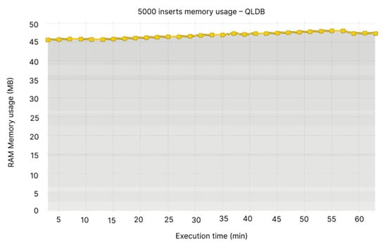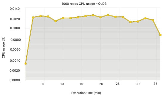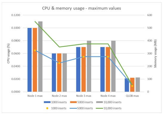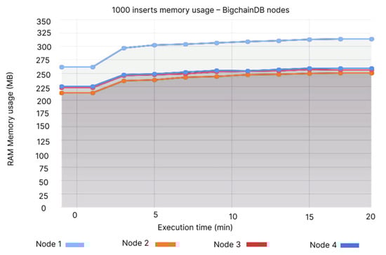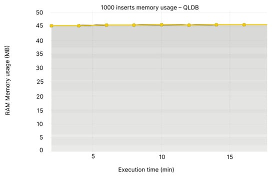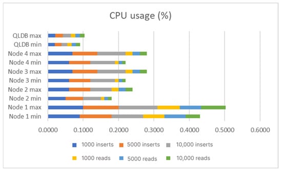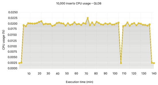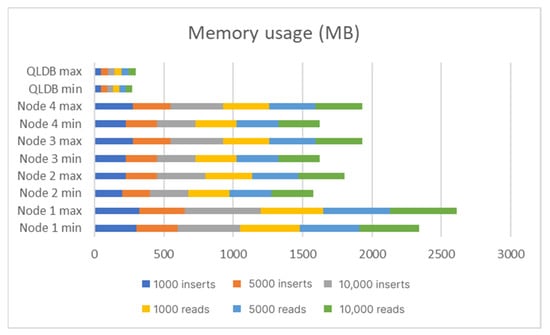 The present experiment was designed to monitor and compare the average execution times, as well as the CPU utilization and memory usages for reading and writing for both Amazon Quantum Ledger Database (QLDB) and BigchainDB technologies. The execution time is defined as the total time it takes until the dataset provided in the request is created and stored in the database, as it is for QLDB. In contrast, in BigchainDB, the execution time is computed by measuring the time necessary for the data to be stored in all MongoDB instances inside every node (this implies that the exact measurement logic is applied for the other performance indicators). A total of four nodes have been configured, as each set of two runs in a Kubernetes cluster. Grafana is the data visualization tool that has been used, and the query interaction was done via Prometheus Query Language (PromQL), a functional query language provided by Prometheus, which is a tool for data monitoring and collecting. The interaction with BigchainDB was possible due to the Python driver supported by the official documentation. In this case, a direct query interaction is not available; nonetheless, if one wishes to query documents manually, this can be done through the nodes’ MongoDB instance that they have access to.