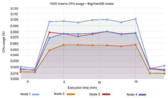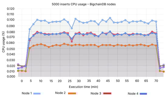 Furthermore, analyzing the use of the same technology (BigchainDB) in two separate instances (case 1 and case 3), we can see that for a small number of requests, such as in case 1, the CPU utilization during the inserts is almost constant, with no significant fluctuations. In case 3, however, we register sharp fluctuations.