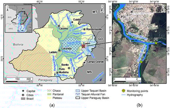 (a) Upper Paraguay Basin, Pantanal wetland and study site at Taquari River in Coxim, Brazil; (b) points of measurement in Coxim: P1 and P3 at Taquari River, P2 at Coxim River.