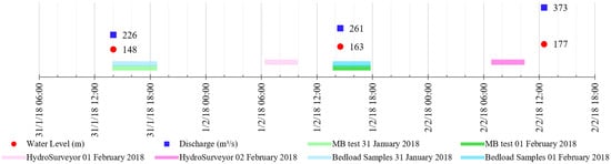 For logistic reasons, it was not possible to conduct all types of surveys (water discharges, moving-bed tests, bathymetry, flow velocities, and bedload samples) on the same days. Table 1 and Figure 3 summarize the temporal resolution and the equipment used.