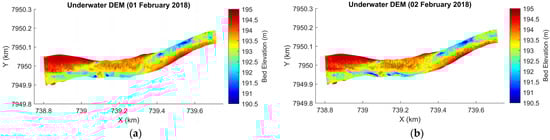 Underwater DEMs generated for (a) 1 February 2018 and (b) 2 February 2018.
