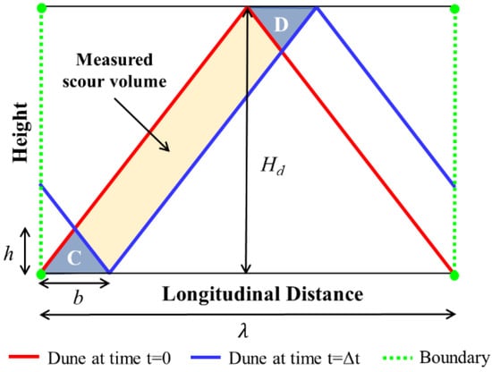 Furthermore, a systemic bias inherent in the methodology underestimates the bedload rates. This error is related to the dune celerity and to the time interval between the surveys. In the process of subtracting longitudinal bathymetric profiles, some scour volumes are not computed (triangles C and D in Figure 5). The larger the time interval and the dune celerity, the greater the not computed volumes and the lower the calculated bedload. Shelley et al. [15] proposed a procedure to correct this systemic bias, represented by Equation (11), allowing the application of the ISSDOTv2 method with large time intervals.