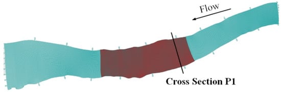 During the field campaign (31 January 2018, 1 February 2018 and 2 February 2018), measurements were carried out at cross-section P1 (Figure 7, Table 3). On these days, discharges were 226 m3/s, 261 m3/s and 373 m3/s, respectively. The mean flow velocity varied from 1.1 m/s to 1.3 m/s, mean water depth varied from 2.0 m to 2.3 m and cross-section width was approximately 110 m. Bedload consists of fine sand (125 μm < d < 250 μm) and medium sand (250 μm < d < 500 μm). Figure 8 shows depth-averaged velocities mapped along the river reach after ADCP surveys on two consecutive days.