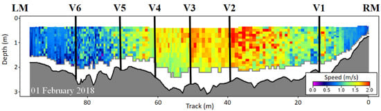 Flow velocity measured with ADCP at cross-section P1 on 1 February 2018. Vertical black lines are the positions of moving-bed tests and where bedload samples were collected.