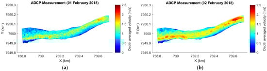 Depth-averaged velocities measured with ADCP and interpolated along the river reach. (a) 1 February 2018; (b) 2 February 2018.