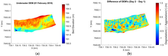 (a) Underwater DEM (1 February 2018) of the region where the modified ISSDOTv2 method was applied; (b) difference of DEMs showing regions of aggradation (+) and degradation (−) between the surveys.
