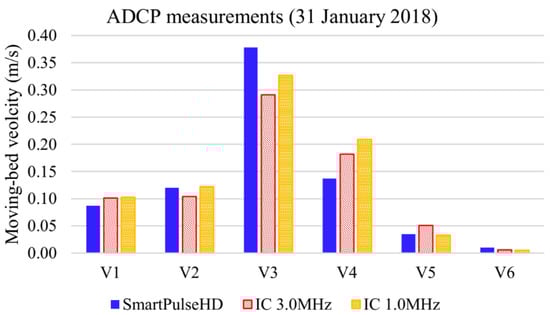 Unit bedload rates were computed at the six verticals along the cross-section P1, where HS samples were collected, and MB tests were performed with ADCP. Despite the highest resolution in water velocities obtained with SmartPulseHD (automatically variable frequency: 1.0 MHz and/or 3.0 MHz), the moving-bed velocities measured with this feature were very similar to those obtained with the two manual configuration schemes (1.0 MHz and 3.0 MHz fixed frequencies). The average standard deviation of measurements performed on 31 January 2018 (Figure 10), for example, was 0.019 m/s. On that day, the highest standard deviation happened in Vertical 3 (Std Dev = 0.044 m/s).