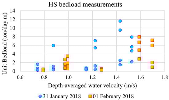 Figure 11 presents the unit bedload rates estimated with HS versus the depth-averaged water velocities measured at each vertical. The low correlation of the plotted data (R = 0.29 for 31 January 2018 and R = 0.44 for 1 February 2018) reinforces the high uncertainties associated with the HS samplings in sand-bed rivers.