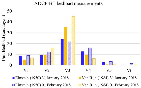 Unit bedload transport rates estimated with ADCP-BT, following Einstein [17] and Van Rijn [27] formulations to compute the parameters of Equation (1).