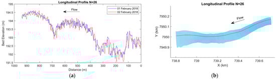 Figure 9a illustrates a DEM (1 February 2018) of the region where the modified ISSDOTv2 method was applied. By the plot difference of the two DEMs (2 February 2018–1 February 2018), the areas with aggradation and degradation during the time interval between the surveys were identified (Figure 9b). Analyzing the vertical variation at all grid points, 96% of the points presented erosion/deposition heights in the range ±50 cm, and 81% in the range ±25 cm. The distribution of the morphological variation was reasonably symmetrical, with 48% of the points undergoing aggradation and 52% undergoing degradation.