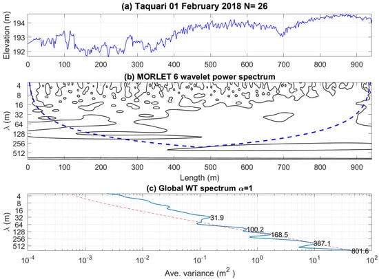 Usually, the first hierarchy corresponds to ripples or small dunes (wavelengths in the order of 5 m), the second hierarchy is associated with medium (10 m) or large (100 m) dunes and the third hierarchy comprises mega-dunes or bars. The sum of the three hierarchies’ signals results in the original signal. More details about the methodology can be found in Gutierrez et al. [16,39] and Torrence and Compo [40].