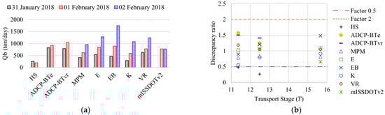 The ADCP-BT method, also called the kinematic model, computes bedload transport rate based on Equation (1), where is the average moving-bed velocity, is the thickness of the bedload active layer and is the sediment concentration in the bedload layer [27,28,29].