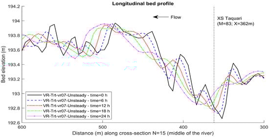 Two pieces of evidence were considered to evaluate if bedforms traveled less than 50% of their wavelength in the time interval between the consecutive surveys (24 h). The first evidence was based on dune-tracking measurements performed with an ADCP in the Paraná River [55], where bed material and flow velocities are similar to those found at the Taquari River, which resulted in dune velocities of approximately 1 m/day. The second piece of evidence was based on the results of a computational morphological modeling of the study site with the Delft3D software [25]. Simulations were performed, testing different sediment transport formulations and providing longitudinal bed profiles that pointed out that dunes traveled less than 50% of their wavelength in 24 h (Figure 17).