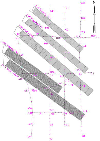 During the mining process in mining area 21, the observation stations of surface movement were established. The observation stations were composed of four observation lines in the north–south extension direction and three observation lines in the east–west direction, as shown in Figure 1. The plane coordinates of the observation points were measured by the Network CORS system [35] and the 2-s total station, and the elevation was observed by the Dini03 electronic level produced by the Trimble Company in the USA [36].