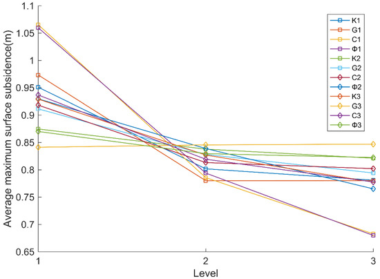As shown in Figure 2 and Table 4, respectively, the test results were analyzed by range analysis and variance analysis. From the range analysis curve, it can be seen that the curve fluctuations of factors C1 and Φ1 were the largest, indicating that these two factors had the greatest influence on the surface subsidence, while the curve fluctuation of factor G3 was the smallest, indicating that this factor had the least influence on the surface subsidence. According to the degree of curve fluctuation and the average maximum surface subsidence value corresponding to each level, the major and minor order of each factor’s influence on surface subsidence and the preferred level can be obtained. However, test errors inevitably exist in the test, and range analysis cannot estimate the magnitude of the test error, so further analysis of the test results is needed, and variance analysis was performed. According to the variance analysis table, when the significance level is 0.05, the factors G1, C1, and Φ1 are significant factors, that is, the influence on the surface subsidence is significant, and other factors are non-significant. The optimal level should be selected for the significant factors, while the non-significant factors can be selected according to the actual situation. Combining range analysis and variance analysis, the optimal level combination of various factors is finally obtained, that is, the best mechanical parameters of each rock mass, as shown in Table 5.