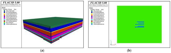 The model used 3440 m in the X direction and 2900 m in the Y direction. Based on the mining depth of the coal seam, 784 m, 884 m, 984 m, 1084 m, 1184 m, and 1284 m were taken in the Z direction. Five strips were mined, and four coal pillars were reserved. In order to reduce the influence of the boundary effects, the model boundary range was enlarged. To monitor the surface subsidence, monitoring lines were set up along the strike and inclination directions, respectively. Considering the large size of the model and in order to better monitor the surface subsidence, different monitoring point distances were set up. The monitoring points farther away from the excavation area had a larger distance, and the monitoring points closer to the excavation area had a smaller distance. Taking the mining depth of 1284 m as an example, the model established is shown in Figure 3a and the mining face is shown in Figure 3b.