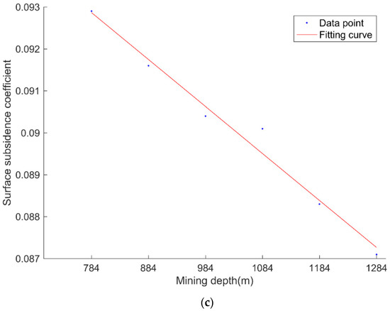 Based on the maximum surface subsidence value, the surface subsidence coefficient could be further calculated, and then a regression curve (curve 3) between the surface subsidence coefficient and the mining depth was drawn, as shown in Figure 5c. The fitting errors of the three regression curves are shown in Table 7.