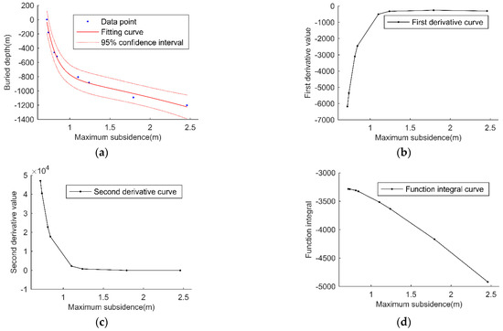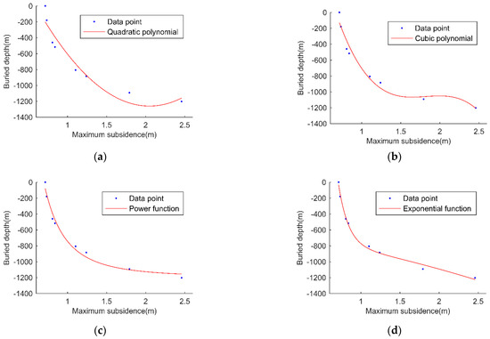 Fitting curve of the maximum subsidence value of the rock formation. (a) Quadratic polynomial fitting curve. (b) Cubic polynomial fitting curve. (c) Power function fitting curve. (d) Exponential function fitting curve.