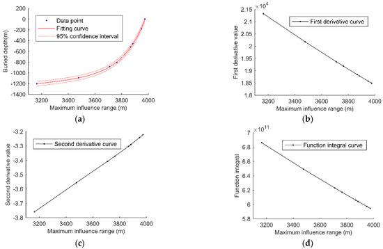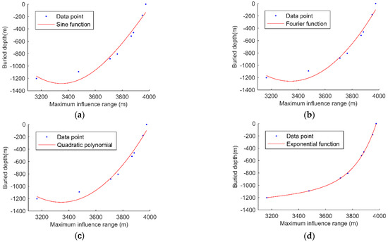 Fitting curve of the maximum influence range of the rock formation. (a) Sine function fitting curve. (b) Fourier function fitting curve. (c) Quadratic polynomial fitting curve. (d) Exponential function fitting curve.