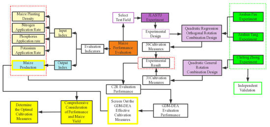 Figure 1 is the flow chart of the full text, which is divided into the following two parts: the corn planting experiment and corn production performance evaluation. The experiment adopts the quadratic regression orthogonal rotation combination design, and the evaluation method adopts the CCR model that can evaluate the relative effectiveness of multiple decision-making units. Based on this model, a new evaluation model is proposed, which is easier to determine the optimal cultivation measures in corn from the evaluation results.