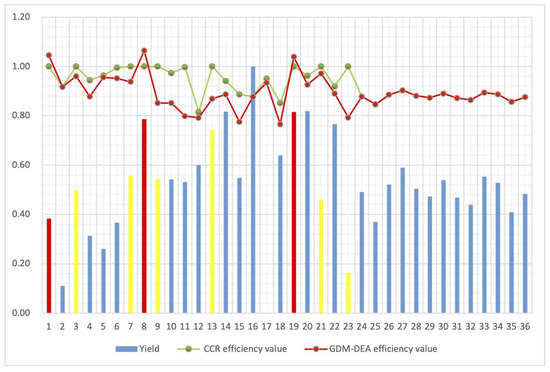 In Figure 2, the red bar represents that the yield corresponds to the cultivation measures that are both CCR-effective and GDM-DEA-effective. The yellow bar represents that the yield corresponds to the cultivation measures that are CCR-effective only. The red broken line indicates the efficiency trend of GDM-DEA, and each broken point represents the efficiency value of GDM-DEA. The green broken line represents the efficiency trend of CCR, and each broken point represents the CCR efficiency value.